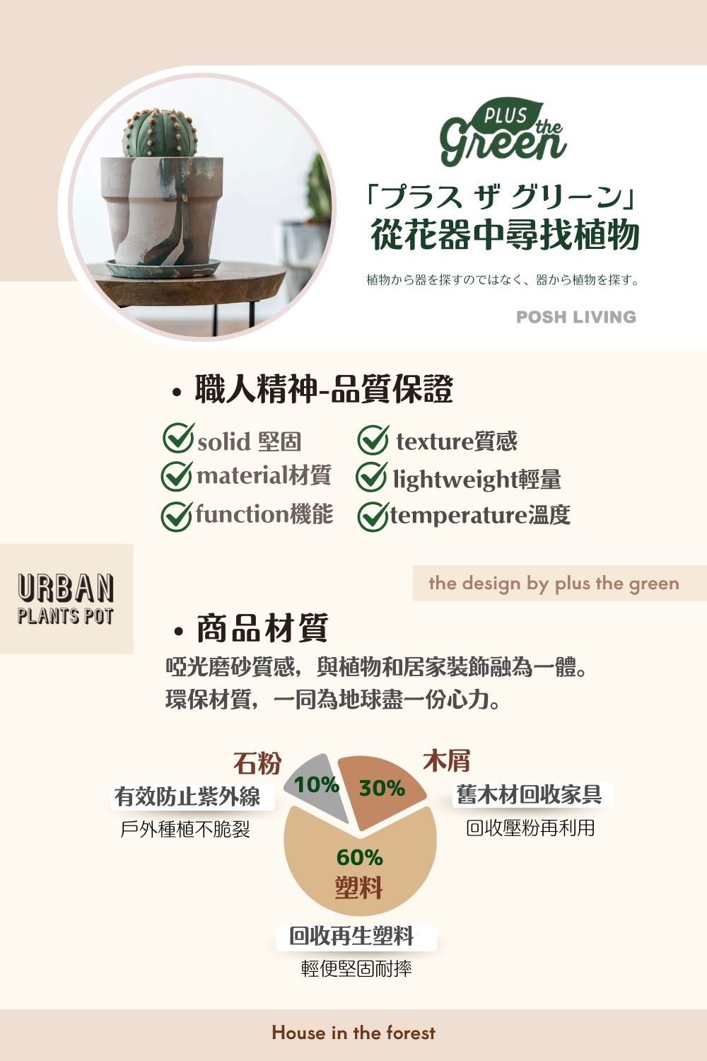 採用廢棄的木屑和石粉混合到可回收塑料製成的特色花盆,啞光質感增添植物美感!